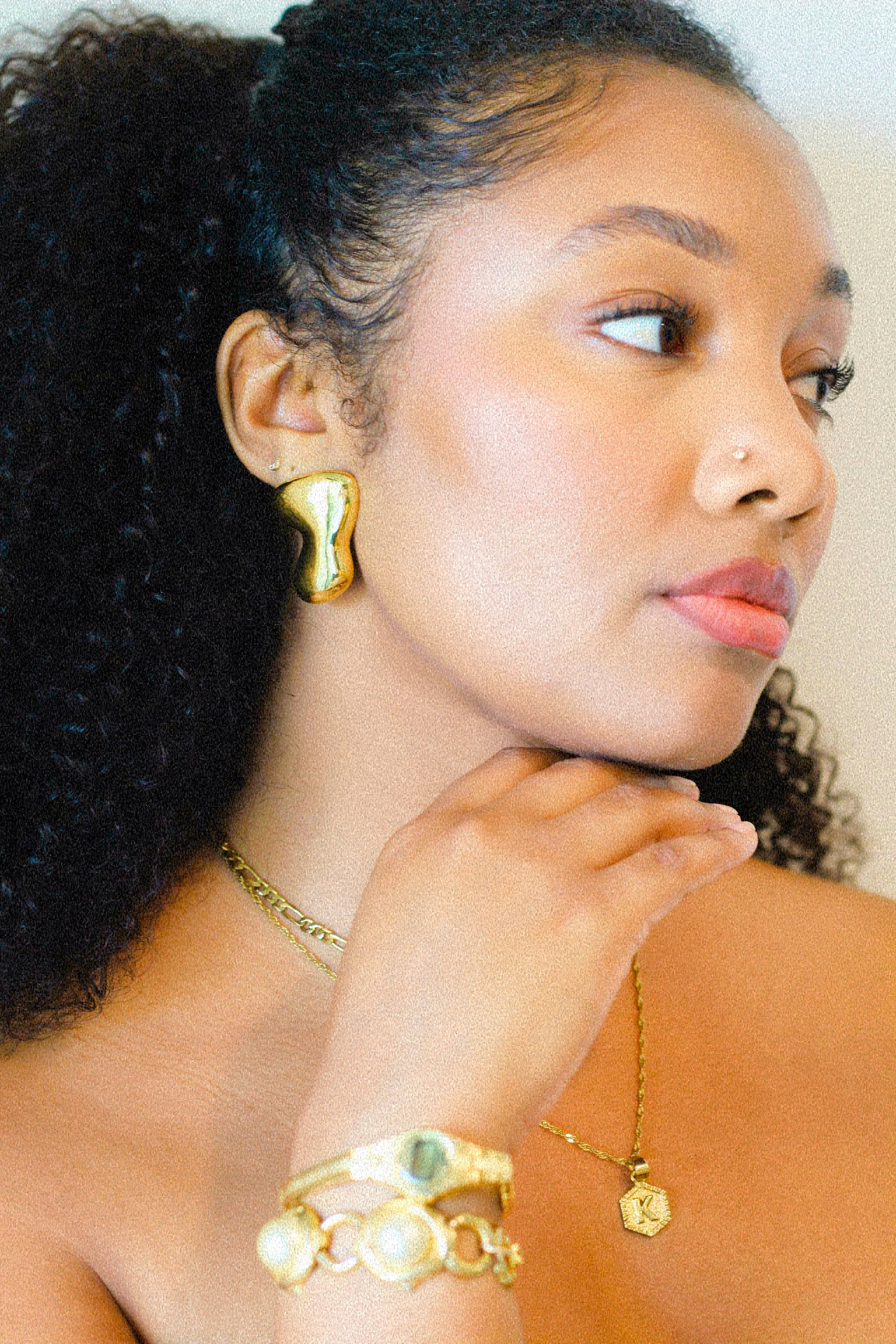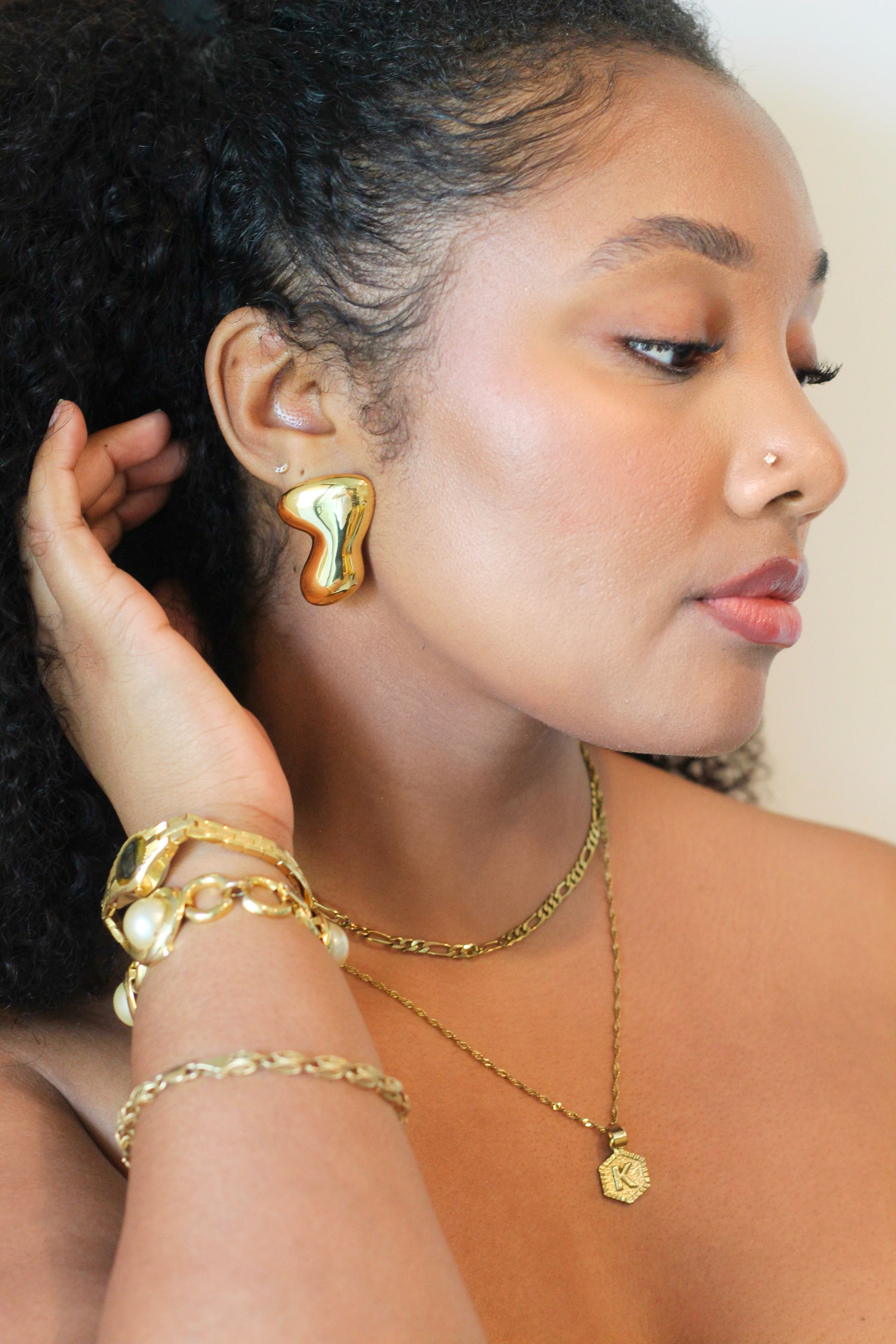 Upgrade your earring game with our Gold Mini Boomerang Studs. Crafted with 18K gold plated brass, these lightweight studs make a bold statement. From Collection by Rin, an iconic and original design.